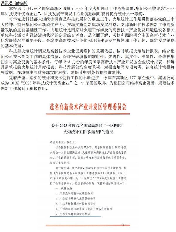 集團公司榮獲茂名高新區(qū)“2023年科技統(tǒng)計優(yōu)秀企業(yè)”