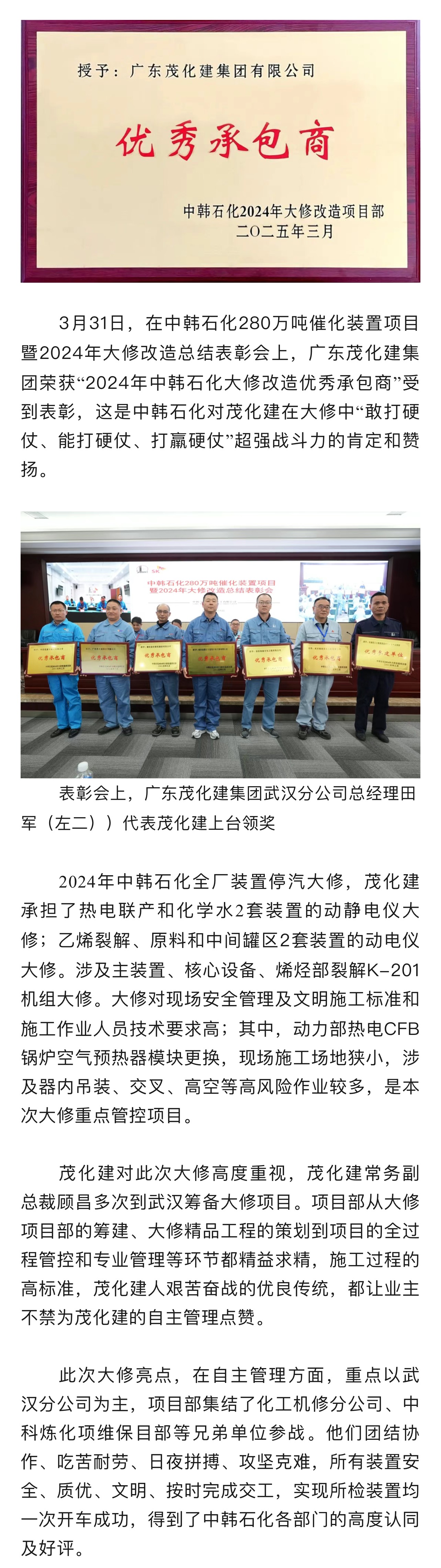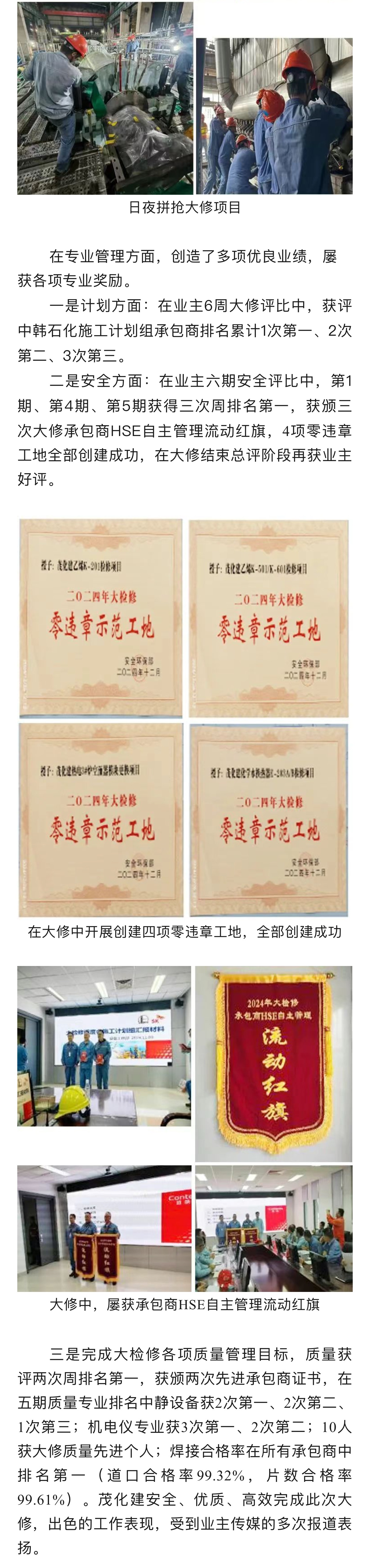 喜報(bào)|榮獲中韓石化2024年大修改造 “優(yōu)秀承包商”稱號(hào)