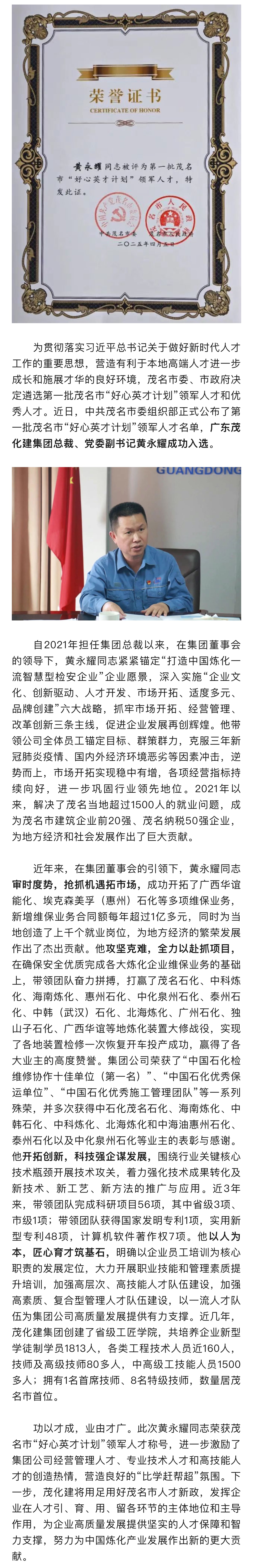 祝賀!廣東茂化建集團黃永耀同志被評為第一批茂名市“好心英才計劃”領軍人才